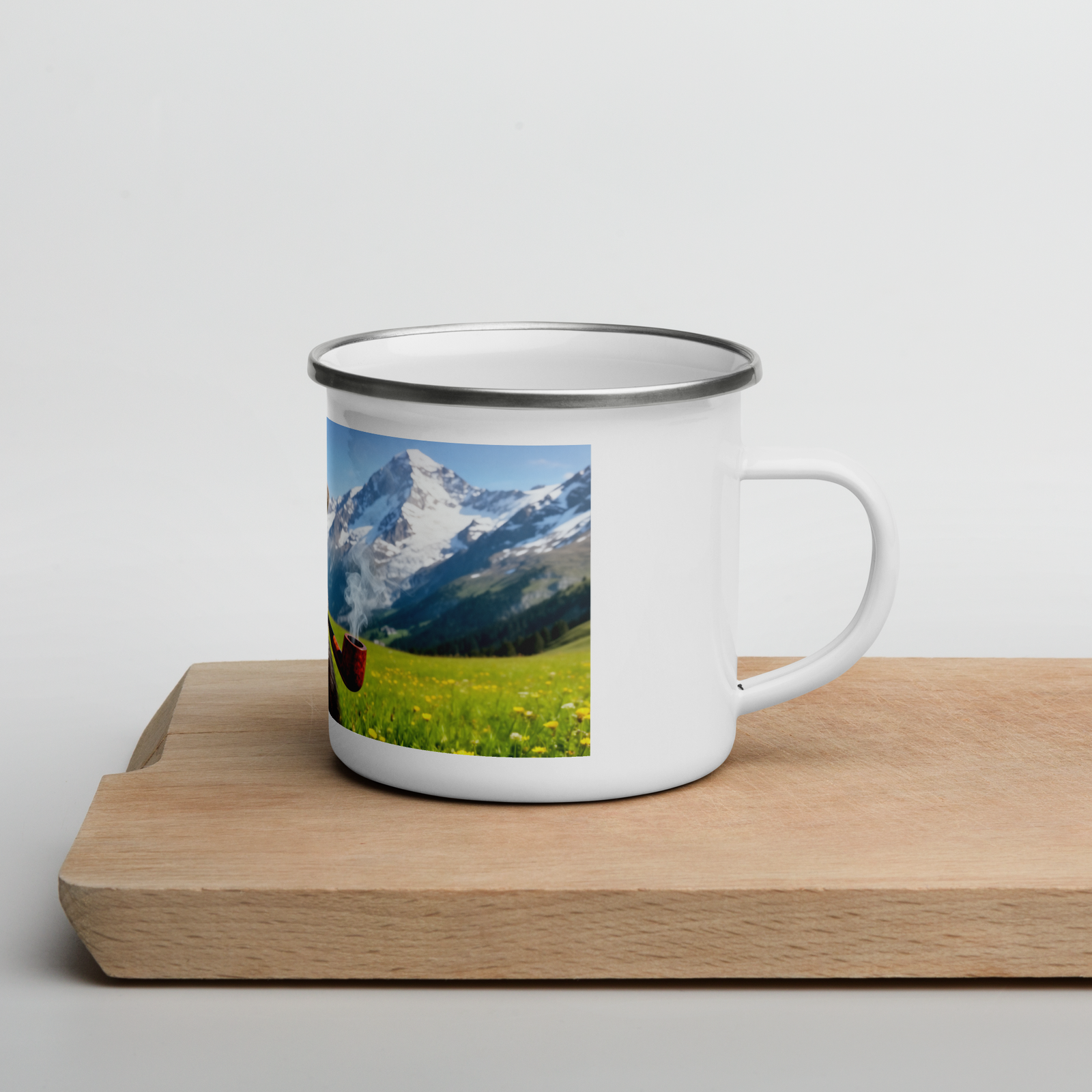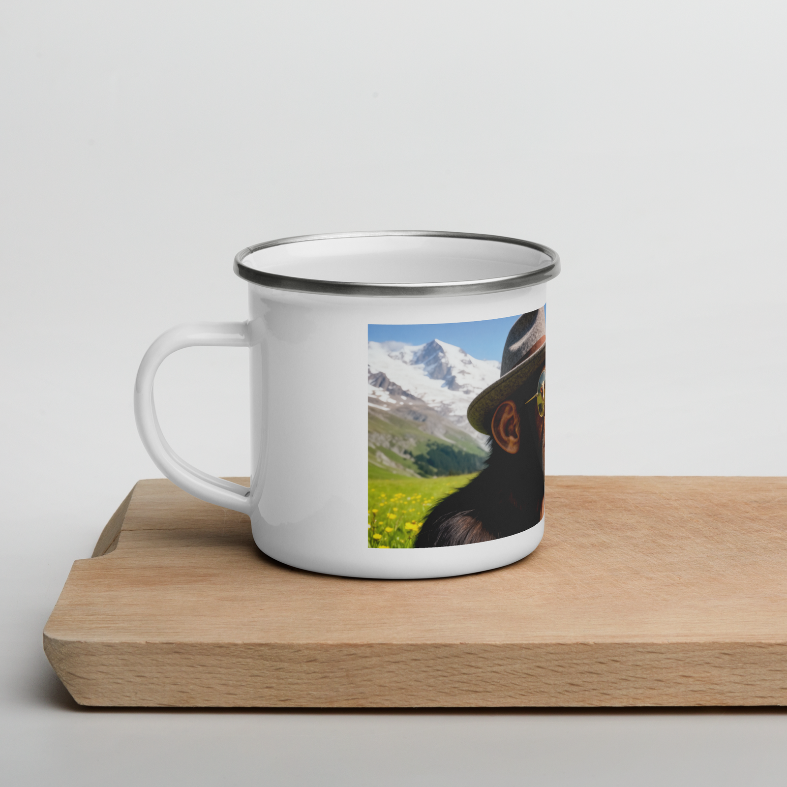 Jeder glückliche Camper braucht eine einzigartige Camper-Tasse. Sie ist leicht, langlebig und multifunktional. Diese mischt alpines Flair mit unserem Maskottchen, Jim Bananas!